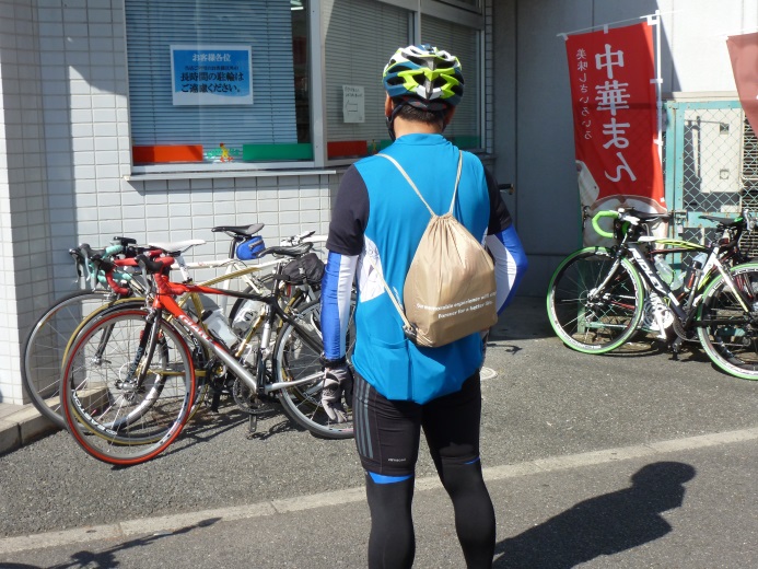 集合写真撮影後、行徳橋に向け出発。復路のコンビニでけんたさんを撮影。けんたさんの背中には築地場外市場で購入したお土産が入っているそうです。快くサイクリングに行くのを見送って貰うためには、お土産等のフォローが必要なのですね。私も見習いたいと思いました。