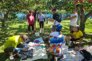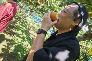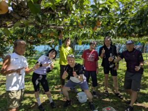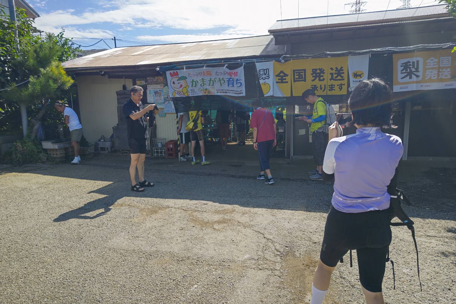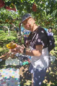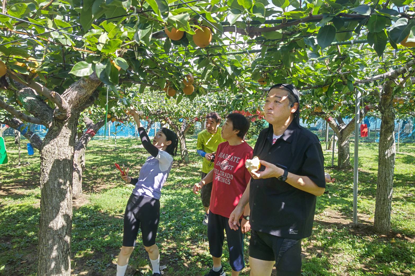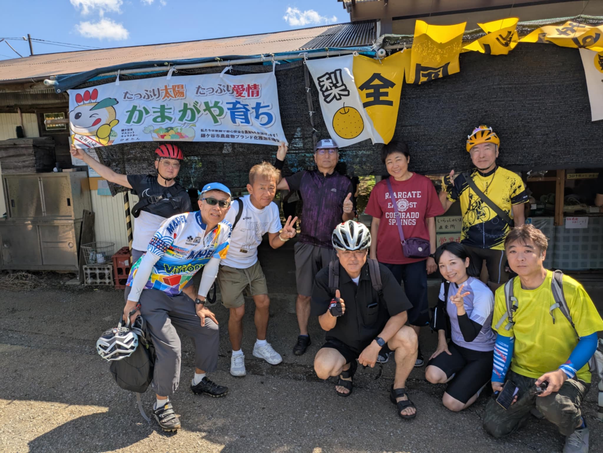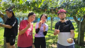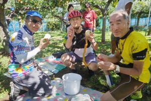 ・のんびりサイクリングと梨狩りを楽しんで、12:10に到着。
