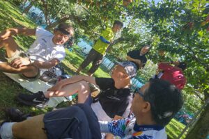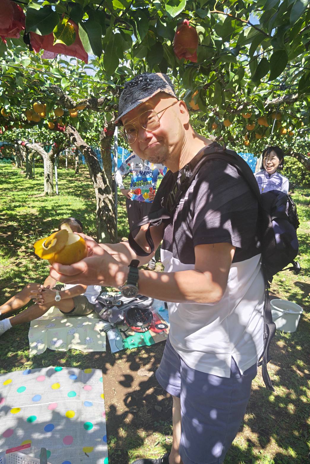 ・木陰にシートをひいて、まったりと梨狩りを楽しみました。