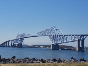 若洲方面へ向かう途中では、東京湾にかかる迫力のある姿の東京ゲートブリッジを眺めることもできました。